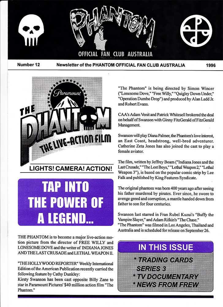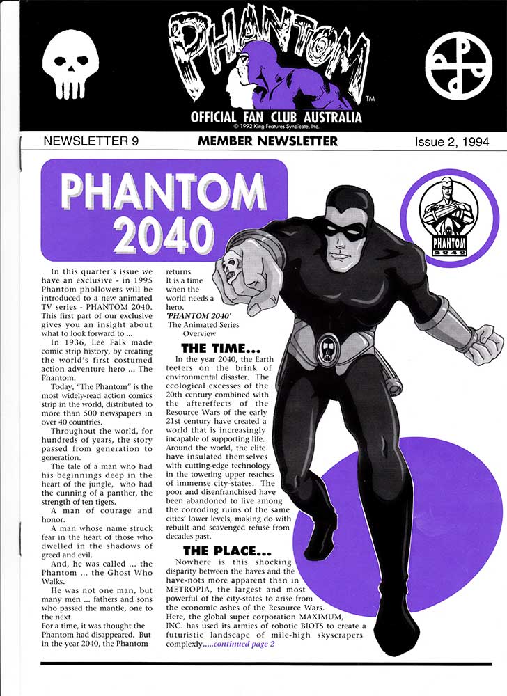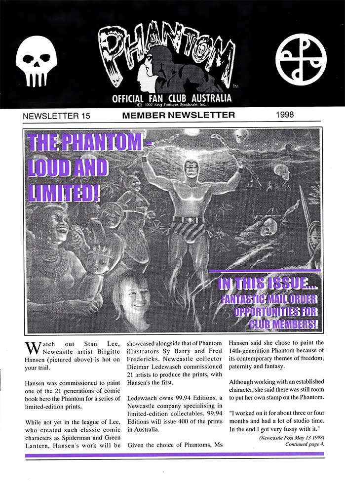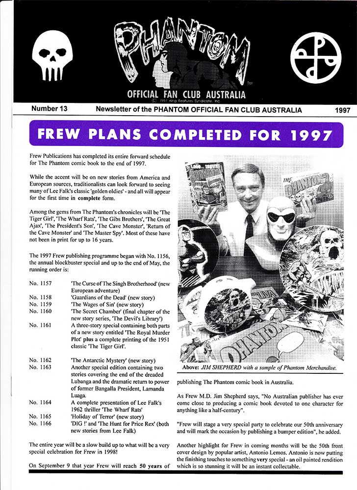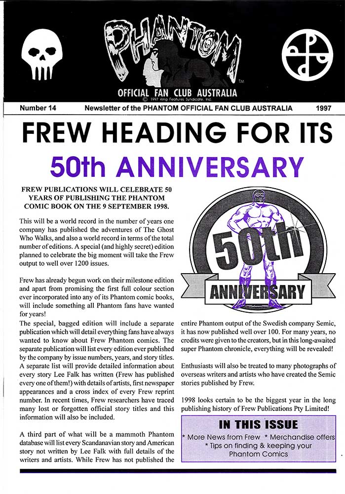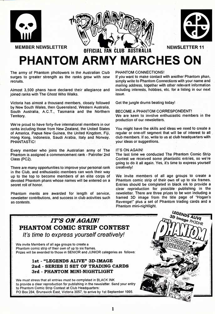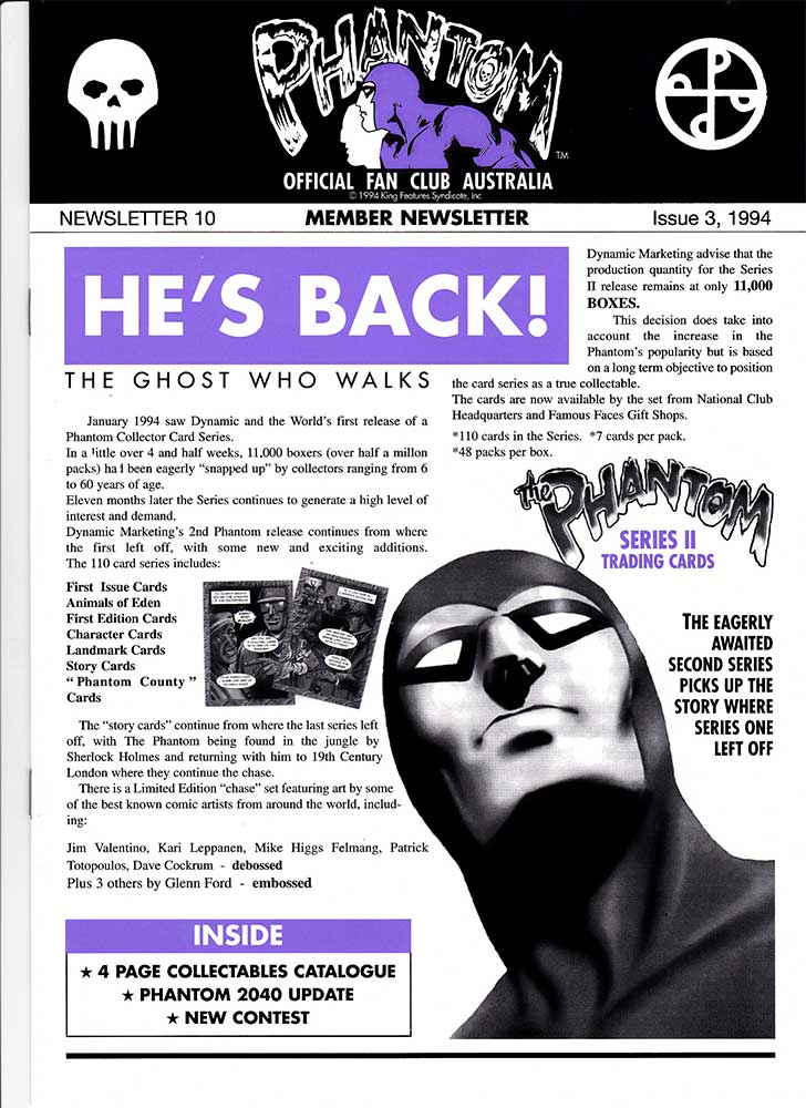 Here we have several newsletter from two different Phantom fan clubs. The first is The Official Phantom Fan Club of Australia which began in 1991 in celebration of Frew Publications' 1000th issue, and ran until 1999 due to King Features not renewing the licence. It was run by a gift/ novelty company known as Famous Faces that also ran fan clubs for Elvis Presley, James Dean, Marilyn Monroe and others. A newsletter was sent out to all members with a total of 15 being produced, although the last of these was released in January of '98.